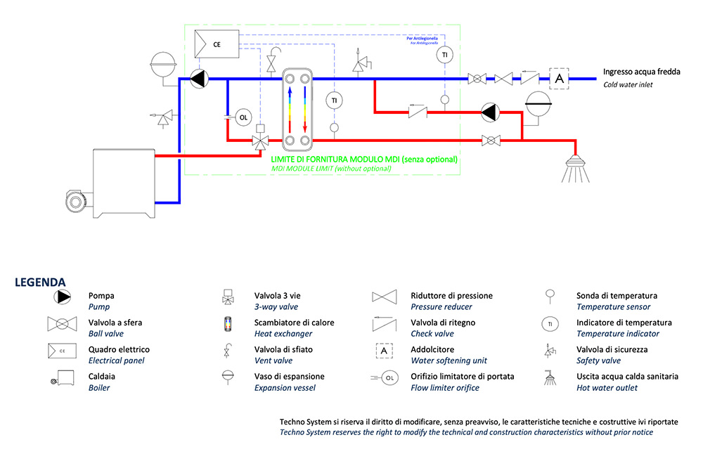Οι σταθμοί παραγωγής φρέσκου ζεστού νερού χρήσης MDI παράγουν στιγμιαία ζεστό νερό με πηγή ενέργειας έναν λέβητα ή αποθηκευμένη ενέργεια σε ένα δοχείο αδρανείας. Λύνουν το πρόβλημα της αποθήκευσης μεγάλου όγκου φρέσκου νερού διασφαλίζοντας έτσι μια εγκατάσταση απαλλαγμένη από Λεγιονέλλα, προφυλάσσοντας την απο την Νόσο των Λεγεωναρίων και προσφέροντας μεγάλη οικονομία έως και 40% αφού δεν χάνεται ενέργεια στο περιβάλλον, αντίθετα, το ζεστό νερό χρήσης παράγεται την στιγμή που χρειάζεται.