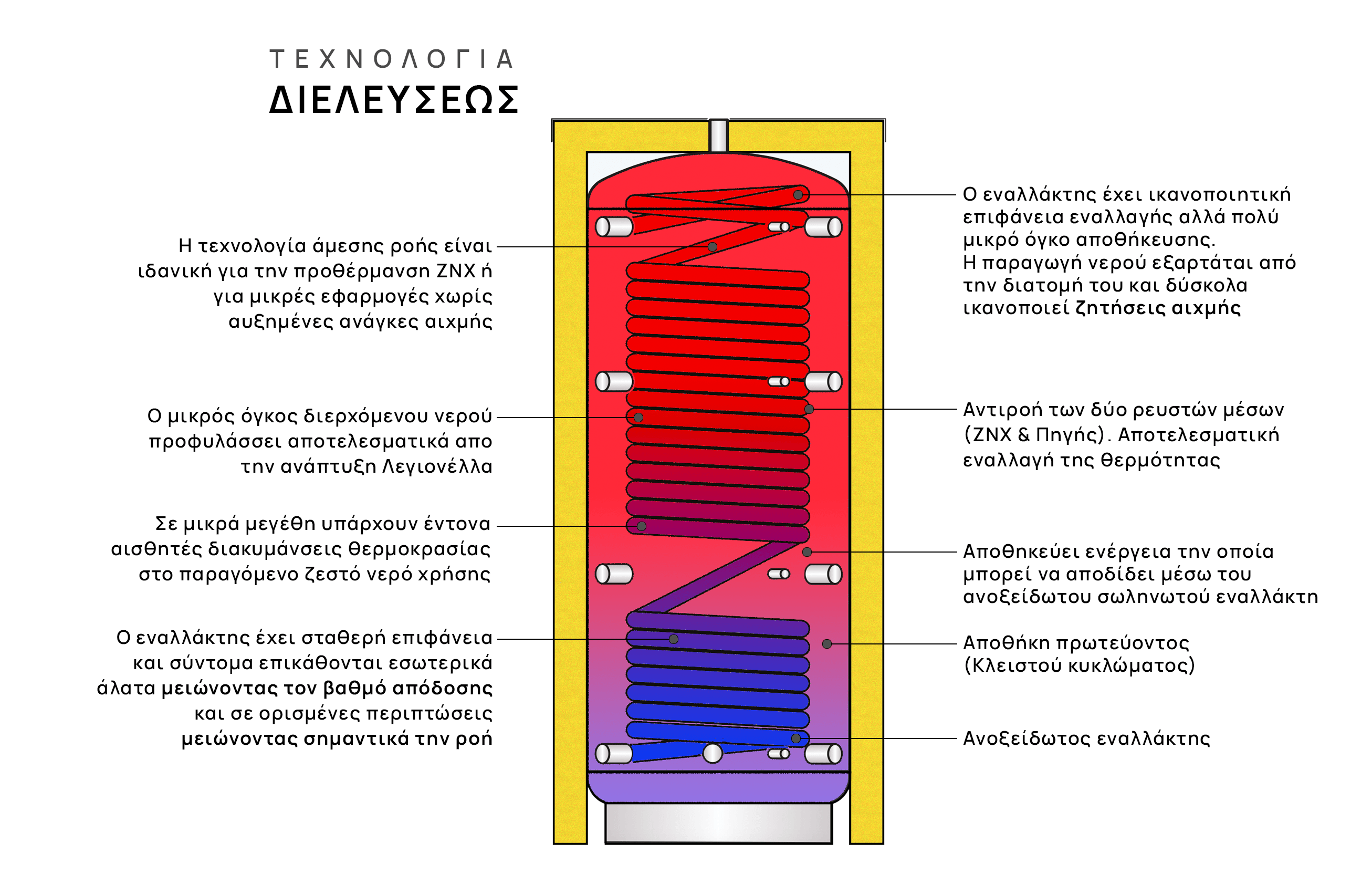 | Κριτήριο | Tank In Tank | Κλασσικά μπόιλερ | Μπόιλερ διελεύσεως (Direct Flow) | Πλακοειδείς εναλλάκτες |